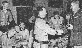 LEFT: Corp. Weyman Crawford, AACS Signals, beats Sgt. 'Ace' Chapman, Kunming Cagers, to the tap in the second quarter of the All-China cage championship game at the Hangar, APO 627, Sunday night, and directs it toward S/Sgt. Dick Hughes, his teammate. Behind the jumpers S/Sgt. Mel Maceau watches the ball, while on the right S/Sgt. Art Hobson and Sgt. Bill Knapp get ready in case the ball comes their way. Pfc. John Aldrich is the referee. (CENTER): Brig.-Gen. Douglas Weart, commanding general, Rear Echelon, present the "General Wedemeyer Trophy," emblematic of the All-China basketball championship, to Lt. James Smith, coach of the tourney winning AACS Signals, in a short ceremony after the games Sunday night, while the rest of the members of the team look on. (RIGHT): Lt. James I. Smith, coach of the AACS Signals, who won the All-China Basketball Championship by beating the Kunming Cagers in the finale of the four-day tourney, gives out with that victory smile as the rest of the team members crowd around. The players are, left to right: Corp. Weyman Crawford, Sgt. Buill Knapp, Sgt. Merve King, S/Sgt. Mel Maceau, Corp. Bill Papapetru, S/Sgt. Dick Hughes, and S/Sgt. Art Hobson. In the rear are S/Sgt. John McNally and S/Sgt. A. DeFalco (Signal Corps photos).