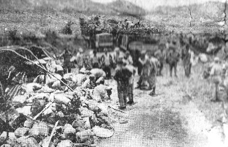 CHIHKIANG, May 24 (AP) - The stench of mass death clings to the mountain tops and valleys of Western Hunan where the enemy's latest offensive has been shattered and victorious Chinese troops are now engaged in a limited counter-offensive toward Paoching. The disruption of the Japanese was so complete and precipitate in many places that the enemy abandoned their dead without even token cremation of parts of the bodies, according to their established practice. In some cases no one was left alive in the holdout pockets. LEAFLETS DROPPED WITH LEAD, BOMBS The Chinese are in the enviable position of being able to issue "surrender tickets" to large groups of their pocketed foe. Thousands of leaflets, hastily duplicated in the Japanese language, have been dumped by CACW fighter pilots as an off hand duty to be performed on strafing and bombing missions. The latest word from forward elements of the Chinese divisions indicated that the Japanese are attempting to group for a stand along the eastern side of the Tzul river which was the starting line for their offensive April 10. The greatest potential danger faced by the Chinese attackers was the Japanese reserves which the enemy failed to commit when the offensive first wavered west of the Chihkiang air base. JAPS WILL FIGHT FOR PAOCHING It is not likely that the Japanese will yield Paoching without a bitter struggle, since possession of that strategic communications center would open the way eventually for a possible all-out Chinese offensive to slice through the enemy lifeline in the Siang river valley. Senior officers of the Chinese Combat Command, the American organization at the front helping the Chinese with supply and advising on tactics, are now cast in the role of moderators. The Chinese command is imbued with the idea of a swift, slashing counter-drive while the enemy is still reeling. LOGISTICS A MAJOR FACTOR Supply through the western Hunan battle-zone presents a terrific logistical problem which thus far has been adequately answered. It is noteworthy that this has been done without air-dropping, although the Chinese commanders know that as soon as they run dangerously low in rice or ammunition big American transports will be there to parachute it to them. The Americans are deeply pleased with the counter-offensive spirit of their allies, but anxious not to overstrain the supply system. Evidently, however, the Chinese have convinced them of a limited offensive for Paoching would be worthwhile. If Paoching can be taken it will be the second American airfield recovered by Chinese arms. The first was Suichwan, which is now occupied in Kiangsi behind Japanese lines. Paoching fell last year to the Japanese offensive that rolled up the Fourteenth Air Force's central line of bases and their recovery would serve to heighten the air assaults, which before the Chihkiang offensive, had reduced the Japanese movement through the valley to a stealthy nocturnal operation.