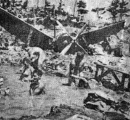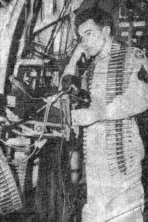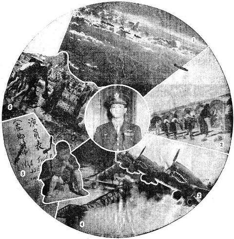 WITH THE 14th AAF 1) On missions over the Fourteenth's 2,300-mile front, a wide variety of weather is encountered. 2) China shrine of the AAF in Kunming. Losses have been light but officers of the AVG, CATF and the Fourteenth who have given their lives for China's freedom rest here. 3) Shark-mouthed P-40s lined-up before taking off against the enemy. The familiar design was adopted by the AVG. 4) Direct hit made on the end of the railroad bridge at Ninh Binh in French Indo-China by the Fourteenth. Loss of the bridge forced the Japs to ferry their supplies and raw materials from Malaya and the East Indies across the river. 5) "Little Tiger Joe," ardent Tiger enthusiast whose life with the Chennaultmen, as recorded by a combat camera unit, is well-known to U.S. movie-goers. 6) Chinese workers building an airstrip for use by U.S. military planes. Circle: Maj. Gen. C. L. Chennault CACW C-47 Sets Operational Mark AN ADVANCED CHINA BASE - An operational record of 404 hours and 10 minutes for one transport plane during a 30-day period was chalked up recently by flying crews of the Chinese-American Composite Wing, commanded by Col. T. Alan Bennett, and line crews of the "Service Commandos," commanded by Col. R. H. Wise. The combined crews made 170 trips and kept the plane in the air 13 hours and 28 minutes per day - more than one half the total hours of the 30-day period. The plane carried a total of 400,691 pounds of cargo, averaging 3,935 pounds per loaded trip. In addition to the crews, 294 passengers were hauled. The average time for each trip was 2 hours and 23 minutes. A veteran at carrying supplies over the rugged mountain terrain and through some of the world's most hazardous flying weather to advanced bases of the Fourteenth Air Force, "Old 410," as the plane is affectionately called by its crews, is a 1941 C-47 transport. Originally operated by the Fourteenth Air Force, the plane was turned over to the Chinese Air Force in August 1942. It was flown by the CAF for two years and then transferred to the Chinese-American Composite Wing in August 1944. Up to that time operational records are not available. Since being in CACW service, "Old 410" has logged a total of 1,345 hours. AAF USING WOMEN PILOTS, SAY JAPS SAN FRANCISCO July 5 (UP) - A Japanese Domei agency dispatch broadcast by radio Tokyo claimed that Japanese anti-aircraft gunners at Kweilin last Saturday shot down three Mustang fighter planes piloted by American women. The broadcast added that they were "dressed in smart outfits possibly designed by Walt Disney" and said that their aerial technique was inferior. Elusive Jap Force Puzzles U.S. Chiefs WASHINGTON - (ANS) - The Japanese air force, or lack of one, has developed into the biggest question mark of the Pacific war with top United States air generals divided over the puzzling question of why B-29s can roam at will without encountering interceptions. Some, including Gen. George C. Kenny, chief air officer to Gen. MacArthur, think the Japs simply have run out of planes. Other believe the enemy force has been whittled down, but that a good-sized number are being held back to resist actual invasion. Brig. Gen. William Flood, chief of staff of the Seventh Air Force, returned from Saipan with the declaration that he frankly is puzzled by the situation. Flood says the question no longer is how good the Japanese plane and pilot may be, instead it is where is he. Military Intelligence has always believed, Flood said, that the Japanese could produce from 1,200 to 1,500 planes a month. Bomber strikes have cut that down considerably but "we are not destroying as many as that." Planes on Japanese home fields seemed to have crawled into holes. B-29s on scouting missions no longer see them scattered around airdromes. Flood said, "maybe they're saving them for a last grand finale to try to fight off an invasion." He said the suicide plane attempts "seem to be letting up."