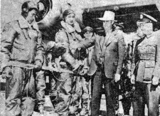HQ., 14TH AIR FORCE - The "Flying Hatchet" fighter group and the "Lucky Lady" medium bombardment squadron have awarded Unit Citations for "outstanding performance of duty in action during the period of April 10 to May 15, 1945 when the Japanese attempted capture the airfield at Chinkiang but were defeated." The Flying Hatchets fighter group is under the command of Col. John A. Dunning, San Antonio, Tex., and the "Lucky Lady" medium bombers are commanded by Col. T. Alan Bennett, Winter Park, Fla. WEDEMEYER IN TRIBUTE TO CHIANG KAI-SHEK NEW YORK - (ANS) - Lt. Gen. A. C. Wedemeyer, Commanding General, USF, CT, said in a Colliers magazine article last week that China's war effort, the target of recent criticism, could be "counted on for valuable contributions to the common effort" against Japan. Gen. Wedemeyer said in the article he had come to regard Chiang Kai-shek "as a great leader and an inspiring unifying force."