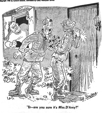 In the March issue of Fortune Magazine the above question was dealt with; here is what the results show: Could Germany become a good nation within 20 years after the war? 21.8% said yes, 37% said it would take longer, 30.6% said Germany never could become a good nation, 10.6% were undecided. As to the ways in which Germany may be treated after her defeat: Abolition of the Nazi Party was approved by 93 percent, 85.7 percent approved of complete demobilization of the German army and preventing of Germans having any arms again, 85.5 percent of the people favor the proposal of an occupying force for several years in Germany. 40.5 percent of the citizens of the United States want to break Germany up into small states, 43 percent want to prevent Germany from building her steel, chemical and automotive industries again after the war. More than three out of five of us are in favor of making Germ,an labor rebuild the devastated areas in other countries at the usual rate paid war prisoners. How do we feel about Germany becoming a member of a world organization after the war? 64.9 percent favor Germany's admission after she has proved her worth, 19.4 percent believe she should never be admitted, 8.3 percent believe she should be admitted right away. These expressions of opinion concur with the general hopes expressed by the Crimean Conference and show that the American people believe Germany can be redeemed for civilized living under firm long-term United Nations control. - JFC ELECTRIC, SEXY AND THREE-CURVE LEGS Do you like girls with three-curve legs? Frankly, it had never occurred to us to diagnose women's legs along this line - legs were always either nice, or they weren't - but along came a girl named Leora Thompson who said three-curve legs are the very best. At the same time, Miss Thompson, who is an artists' representative, spoke of legs with character. And she blossomed forth with a list of the ten pairs of U.S. feminine legs which have the most character. Here they are: Sexy, Mary Howard; luscious, Ann Miller; exuberant, Elsa Maxwell; adventurous, Martha Tilton; provocative, Mrs. Donald Novis; carefree, Martha Scott; sophisticated, Evelyn Ankers; tenacious, Madame Frances Perkins; electric, Carole Landis; and daring, Lily Pons. Mary Howard, said Miss Thompson, is the only girl she knows who has three-curve legs. And what are these curves? "Well," she said, "the one along the thigh, the one in the calf, and a v-e-r-y subtle little curve just below the knee on the outside." How do you feel men? Adventurous? Electric? Sexy? BE SECURITY CONSCIOUS Enemy espionage agents are continually attempting to learn information of Allied military activities and plans - more so in this theater than in any other. Becaise the Jap is fighting a losing war he has redoubled his efforts to illicit information from both civilian and military personnel. It is the duty of all personnel of the Bengal Air Depot to not only be constantly alert against talking about military operations and plans but to report all persons who show interest in their military activities. Most counter-intelligence agents of the Allied forces are known to the enemy - and they are avoided. Thus, the success of the investigating agencies depend on the information given it by those it serves - you. If you see or hear anything that seems the least bit out of the ordinary report it to the Intelligence Office immediately. Be careful - be watchful of the men or women who try to elicit even insignificant information by flattery, argument, sex, belittling our country or the war effort, gifts, sympathetic understanding of your troubles, impressing you with their importance or a knowledge greater than yours of what is "cookin'." When you report an incident do so as quickly and in as much detail as possible. Nine-tenths of the success of an investigation depends on the original information - WHO, WHEN, WHAT, WHERE. ![]()
