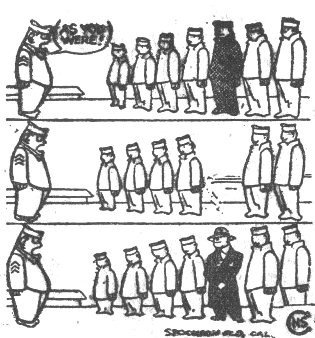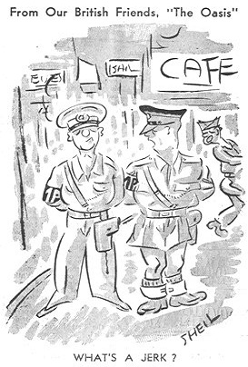In this column you can see a picture of a Jeep. It is obvious, after a glance, that the said Jeep is not quite in running condition. It is also quite obvious that said Jeep was rendered thusly by violent contact with another vehicle. Which, has been happening far too often for the good of the depot and the personnel therein. Altho' by far the larger proportion of the men who drive cargo vehicles for the depot are careful drivers, there are a few who insist on breaking regulations and thereby causing great grief both to themselves and the vehicle they are steering. An example of what happens to those careless drivers is shown in the photo of the Jeep. Every depot driver knows the speeding zones on the roads to town and through town. And every one insists that he keeps to those regulations; yet any trip to town will disclose numerous speeders. Thirty miles an hour is quite fast enough for any vehicle. The Army recognizes the fact that military missions are to be considered as urgent; and taking that into consideration it regulated the speeding to thirty miles an hour at a long stretch of the road to town. There is very rarely any business that requires driving any faster than that. Especially 6 x 6 vehicles, which are cargo vehicles and are not used for emergency missions. When the number of vehicles using the road to town are taken into consideration and the total mileage rolled up is weighed the record of the depot drivers is very good. But it can and must be made even better. Not only are there cases of vehicles colliding but the hitting of beasts is occuring with too great a frequency. It must stop; for it is causing the Indian population to look upon American soldiers with little flavor. When you stop and think you will realize to what a great extent we depend on the Indian people for our substinence and help in prosecuting the war - which is why we are here in the first place. Too many accidents can cause the ill feeling to run to such a high degree that the Indian population will refuse to cooperate with the American military authorities. When that happens, we may as well go home; for we'll be of no use here. We know that the subject has been harped on before. To you concerned it is probably an old story. But remember, it may be old but it is also important and true. We don't think it is asking too much of intelligent men to ask them to drive carefully - which means no unnecessary speeding, a little respect for other drivers (including Indian and British) and a little care when approaching pedestrians on the road, be they animal or human. We know that you will co-operate. ![]() Being a lowly GI, I am sort of bewildered at some of the things that occur on the depot, so I have decided to consult you on several things, trusting you can enlighten me on these matters in order that I won't hold such a prejudiced attitude. First, why doesn't our depot have a post band? I know that you will say that there is one being organized. But that has been going on for months now. Evidently a few people here do not approve of having one but from general discussion amonst the GIs, I know it would be a wonderful morale booster. The boys who are trying to organize the band are working very hard but working also against obstacles which could be eliminated very easily. These men perform their regular duties during the day, then devote their own time in the evenings for practice and rehearsals. Then what happens? The trombone player is sent out on DS; the piano player is placed on night duty and so forth, very thoughtful of someone, don't you think? Everybody wants a band, letters are coming in and requesting the band to play here and there, the instruments are here; we've got musicians who are talented and experienced, but all in all, the band has yet to make their debut. I know if I had anything to do with it, I'd certainly throw up my hands and tell them to go to blazes. If the boys are willing to devote their spare time to entertain us GIs, why can't a little co-operation be offered by people who have the authority to make it easier for these musicians. Everybody wants to take credit for the band but nobody wants to do anything to help them. I hope some statement relating to this subject can be printed in your paper as we certainly are in a fog as to why its so hard for us to form a band, us especially, Americans. While we're on the subject of bitching; whatinell is the matter with the laundry situation. Can't they put an officer in charge of the whole works and get some kind of a system worked out so we can get some clean clothes at least one evry two weeks? LAUNDRY BLUES By Ed. McManamon. Scene: Any supply room on the post. Time: The Thursday after the Friday that laundry, trustingly submitted on the previous Monday, was supposed to be returned. Characters: Supply Sgt. and any one of a few thousand GIs. ACT 1 SCENE 1 Sgt: Well, I pulled a few strings for you and got your laundry back in only 12 days. GI: Thanks, Sarge, it sure will feel good to get some clothes on in place of this (He fingers the sandbag which is his only covering). Sgt: Of course, you can't expect service like this all the time. Sometimes there's a slight delay before the laundry is returned.