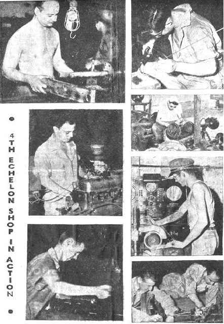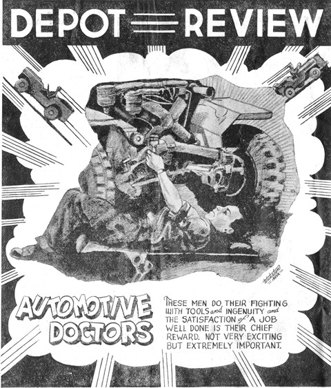 "COMMANDO" PLANES FOR INDIA-CHINA THEATRE C.J. Brandewide, an official of the Curtiss-Wright Corporation, aircraft manufacturers, said that Curtiss plants at Louisville and the one at St. Louis have started making the U.S. Army's giant "Commando" transports. Both plants were recently converted and previously manufactured other types of aircraft. They supplement production of Commandoes at Curtiss-Wright's two plants at Buffalo and the new Higgins aircraft plant New Orleans. The U.S. Army Air Transport Command recently authorized an announcement that Commandoes make up three-fourths of the aerial fleet carrying war supplies to China. Commandoes went into service on the Himalayan assignment in the first week of May, 1943, after 30 of them had established a new chapter in aviation history by flying nearly 15,000 miles across the Atlantic, Africa and the Middle East with pauses only for refueling. Bombs and ammunition, as well as everything else that is needed in that war theatre, are flown to China in Commandoes. The planes carry drums of petrol and oil for Maj. Gen. Claire L. Chennault's 14th USAAF as well as personnel, weapons and food. On the return trip from China, the planes carry precious minerals, general freight and personnel. Curtiss officials said a large proportion of Commandoes will continue to go to the India-China war theatre. Others will be added to the domestic transport fleets of the U.S. Army, while some will be used in overseas theatres. -USOWI ![]() The second in the series of articles concerning the work of the men of the depot is above. This one concerns work in the maintenance of Army vehicles. It is a very important job and it is being done well. The men who are doing that work are important in the Army's scheme of victory; if they weren't they'd have been stuck somewhere up front against the enemy with a gun in their hands. The Army has chosen these men to fight the enemy in another way, with tools and mechanical skill; but a way just as vital and realistic as personal contact with the foe. From our own personal contact with these men we know that some of them aren't working as hard as they could, but on the whole the men are putting out as much as they are capable of. These are the men who are in a hurry to get home; and they know that the quickest way to get home TO STAY is to beat the enemy. Their only means of beating the enemy is by keeping the supply vehicles on the move. And they are doing an admirable job. Next week's issue will feature the third depot group to fight the enemy with screwdrivers and mechanical skill instead of carbines and grenades. Many of the companies of the depot are being done an injustice by their organization reporter. The reporters for several outfits fail to turn in copy, refuse to attend meetings where the welfare and betterment of the paper are discussed and show a complete lack of interest in the duties they were assigned to. It is now time for action. It is the duty of every outfit with a lethargic reporter to either get him to do his job or get another man. Every organization deserves to have its work publicized. There is no reason for any company to have to stand for the complete lack of interest that has been the stand of several reporters. There is much that can be told about the fine work of the individuals of the depot and the organizational representatives are the ones to do it. We promise to print anything within reason. We reserve the right to keep malicious gossip and smut out of the RAG. The Base Censor takes care of the censorship angle. So, fellahs, if your representative on the RAG isn't doing his job, why not get someone who will? There seems to be a misunderstanding about the ruling on rolled sleeves in town. Here's an explanation: GIs may roll their sleeves up until 1800 hours. The sleeves, if rolled at all, must be rolled neatly over the elbow. After 1800 hours, short sleeves and rolled sleeves are taboo. And that last one is not just a lot of "chicken," merely good common sense. The malaria mosquitoes bite in earnest after the sun starts to go down and inviting them to take a bite of you just isn't good common sense. We would like to thank the few men who are contributing much to the RAG besides their weekly organizational column. They are Al Pharo of the 2005th, Jeep Friedman of the 2082nd and Fred Jones of the 1953rd. If there were a few more like them, the TIGER RAG would have all depot news and nothing else. We need more GIs like 'em. - THE ASSISTANT EDITOR