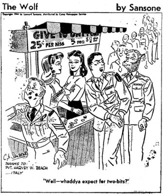 I have often been criticized time and again by my brothers in uniform on my habit of talking to myself. My only defense to this accusation is that if I want to engage in an intelligent conversation I naturally have to confab with myself. I have noticed though, that others have the same habit only they don't seem conscious of it. I have stood in the chow line time and again to hear the fellow in front or behind say softly as the menu becomes known, "Spam, spam alla time spam." Its sort of natural to say that even though you haven't got an audience. Again sometimes in the morning as I am starting my truck for the daily grind the guy in the next vehicle will scream apparently to the winds themselves, "Where the hell is that gear shift knob again," of "May blankey blank fall upon the head of the guy that took my seat." Often wonder myself too why there is such a shortage of those things. Talking to ones self is sometimes brought about by circumstances in which one participates such as the sad sack who loses a month's pay in a crap game. These individuals will arise from the grounds of the tournament at first too shocked to do much else but walk away deathly quiet. Then as he proceeds some distance from the crowd will commence to wave his hands, shake his head and move his lips framing sentences all addressed to himself. - I think many great speeches on reform go to waste in this manner Being called down by an MP is a sure thing to bring on fits of self conversation. What happens to that guy in ones mind shouldn't happen to a dog and if you should carry your plans out they would book it as malice aforthought so you're stuck either way. Last night I heard a fellow talking to himself in his sleep, he thought he was talking to Mary but he wasn't. I'm planning on laying awake tonight and listen in again. he is very enlightening on certain subjects of romance. I bet this column isn't going to go over very big this week but I at least try, don't I? - Rockey