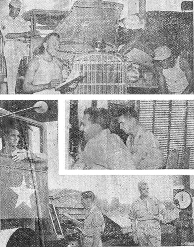 Amiable S/Sgt. William Fuller from New York City, who rules his roost with a capable hand claims: "I have the finest men on the Depot. They realize they're here for a purpose and they're doing the job the way it should be done." S/Sgts. Claude L. Henderson from Saltville, Va., Herbert W. Hardy of Robbins, N.C., the mustached Albert Rangus of Lorraine, Ohio, Joseph C. Comstock of Chicago, Alvin S. Jackson from Monroe City, Mo. and Herman C. Riggleman of Franklin, W. Va. are all in agreement that their GI drivers are constantly on the ball and they couldn't want better men with whom to associate. TRUCK DRIVERS It was a serious Lt. McAnnelly who spoke up for the drivers of every type of vehicle on the Depot, they being too numerous for the Tiger Rag to mention. In calling them the backbone of the Depot, he lauded: "To those hard working, hard sweating, and sometimes hard cussing drivers, honor is indeed due. For they are the ones who keep on the constant move and on time the supplies, the repairs, and the equipment that have made the Bengal Air Depot a byword throughout the IBT. Day and night they are out there through heat or monsoon, bending their backs to an unglorified and unexhalted work. "Their tasks are just as critical and as important as any completed by their numerous brothers-in-arms. I am proud to have been placed in charge of men of this calibre and of being able to work with them." Praise that can be repeated for each and every man of the Depot Motor Pool who work as a close, compact unit and help bring defeat earlier to the Japs. Friends in Civilian Life Meet Here For some it takes a favorite melody to revive the pleasant past but to newly arrived Pfc. Karl Nickoleit of a signal unit it was a drawling voice that invoked the beauties and wonders of his native California. A glance at the orator and, "Why Jack, you old so-and-so." For it was Sgt. John A. Merrel of another signal outfit whom Karl had last seen in 1942 as a fellow worker and bosom pal at the Western Electric plant in Los Angeles. John had been a repairman while Karl was an appraiser. The usual review of friends, family, careers and opinions of India followed. The next day Karl was assigned to Signal Engineering. The first GI his optics rested upon was John who had been there for over a year. "It's a mighty small world," exclaimed the startled Karl.