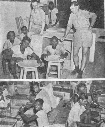 SUPPLY CARPENTER SHOP NOISY BUT MAKES BOXES FOR SHIPPING You step through one of the several entrances leading into the Depot Supply Carpenter Shop and hesitate. In self-defense you almost have to. For even before your shoes contemplate invading the inside your ears are curled, bristling in rebellion against the crescendo of noises tearing around outside with almost a physical force. Inside, it is a physical force with the 'almost' completely dropped down a crack. Hundreds of hammers are pounding, clacking, and making singing nails bite deep, building things from lumber; anything and everything. Saws scream and wail sobbingly like banshees. Workers yell to each other trying to weave verbal understanding against the din. Lumber being dropped rawly awaiting construction and finished items being loaded, all contribute to the bustling clamor. This is the Depot Supply Carpenter and Cabinet Shop at work with one officer and four enlisted men guiding the carpentry labor of over 1,000 civilian Indian workers. Capt. Gammon M. Friend of Greensboro, N.C., is the officer in charge of this busy organization with Sgt. Clarence R. Bradway of Oklahoma City, the NCO kingpin. Capt. Friend, due to a myriad of additional duties, divides his time between the Carpenter Shop and elsewhere, but Sgt. Bradway who figuratively grew up teething on timber roots controls all problems that arise when Capt. Friend is tied up with another knot somewhere. At present, Capt. Friend is taking a rest at Darjeeling and reminiscing no doubt, of those more pleasant days Stateside when he was Sales Manager for the Fuller Brush Company and could enjoy the company of his wife, Mary, and their small daughter. Sgt. Bradway began his experiences in the timber woods of Michigan and swung down through the logging camps to stop in Oklahoma. Here, he worked for a times as a construction superintendent, built houses and owned his own cabinet shop for five years where he specialized in rebuilding antiques as well as modern furnishings. The normal capacities of the Supply Carpenter Shop on all pieces of work like stools, office desks, cabinets, all size boxes consumes around 35,000 square feet of lumber daily. That, speaking woodenly, is quite a few toothpicks. And speaking economically, the beauty of this consumption is that much of the wood for these numerous articles comes from incoming packing boxes which are torn down or from salvage, and are then rebuilt into whatever article is demanded from some section of the Depot. Nine saws, operated mainly by trained Indians, hew all the lumber to the required dimensions. One of the saws in use is a captured Italian machine. In addition there are four cutoff saws, two ripsaws, and one large and one small bandsaw. These, to coin a noisy phrase, make the "sawdust flow like wine" with the said sawdust being utilized in the paint and dope department for packing and crating. All intricate woodworking such as decoratively designed table legs, desks, handles, and other furniture accessories needed for Depot Supply is supervised by Cpl. Willis S. Wagner of Boonville, Arkansas, who is the shop foreman and a savant in rolling out artistic creations on the lathe. Wagner like Bradway, also had his own cabinet shop in civilian life and reproduced antique furniture. There are two reasons why to him Boonville is the "best doggoned town ever nailed together!" Wagner's wife, Naomi, was raised there and that's where his nine year old son Jerry, whom Wagner "wouldn't take anything for" is growing up. Many of the Indians employed in the carpenter shop have learned a higher degree of lathe turning under Cpl. Wagner's guidance. A rush order which the shop was just finishing was a request for 1,000 sturdy box pallets. These are platforms on which crated merchandise is stored and may be speedily transported elsewhere or loaded compactly into trucks by finger lifts. All types of sign work in addition to painting and protecting finished raw articles is controlled by Pvt. Philip D. Adair of Punta Gorda, Fla., who is the paint and dope wallah. Adair stated that as long as he had been with his department a contunual deluge of sign requests prohibited the crew and himself from ever catching up. One look at the signs scattered around, and those in the phase of completion, is ample proof of his veracity. On your first impression a note of lush aristocratic grandeur lingers in the paint room. For you notice a coolie sleepily pulling a rope which gently activates a broad fan whispering and swinging overhead. Pvt. Adair squelched the personal thoughtful angle however by explaining that the fan was primarliy installed to keep the paints cool. Adair, when the "shootin's over" intends to establish his own paint emporium and settle down with his wife, Louise, to a "colorful" future. The Shop, besides the 500 odd carpenters employed directly inside the building, have another 500 workers who help both inside and out with loading finished products, carrying lumber, pulling nails from scrap, and doing miscellaneous chores.