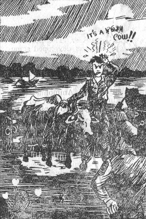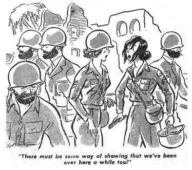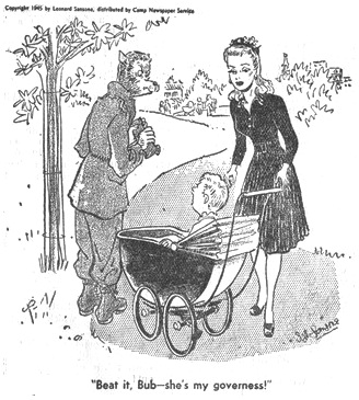 "Sahibs, sahibs," he cried, gesticulating toward the river, "guy fall in panee, butcha too." "Quick Tom," said Gessner comprehending "a guy and a baby have fallen into the river!" Sgt. Gessner hung on the piling above the river. Half his body was immersed in the water and with his legs wrapped around the post he was holding the struggling head above the water. "She's too heavy and the current is too strong," he gasped, "run for a rope." hardie dashed for the nearby jute mill, Gessner, straining every muscle, was weakening rapidly. Alternately, the little Indian prayed sanctimoniously in a quiet wail and then in frenzied Hindustani intermingled with English, implored the puffing Gessner to hold on... "Alright, Ed, you can relax now, I've got the rope around her," said Hardie, who with the help of a Scotch jute walla, was hauling the half-drowned carcass from the river. "We didn't mind effecting the rescue, but why did he lie to us in the beginning?" Hardie asked of the Scotchman, pointing a menacing fist at the little brown man. "Yeh," shouted Gessner between breaths, "what's the idea of him dashing up to us on the road and telling us a guy and a baby were drowning? That's what he said, a guy and a butcha and I know 'butcha' means baby." The Scotchman's eyes twinkled and glancing toward the rescued beast replied, "Aye, that's true enough boys, but there is one Indian word you overlooked, 'guy' means cow in Hindi." "What about the baby?" countered both GIs together. "That's just what you rescued, a pregnant cow!" The soldiers looked quickly to the little Indian's innocent face. American style, he winked... PX HAS ABOUT EVERYTHING NOW Even PX personnel express wonder at the many new items to be found on the PX shelves these days. "We've got pretty near everything we ever had in the State's," was the awed comment of Cpl. "Frenchie" Talbot at the curio counter, now one of the busiest there. "Look at these lipsticks (honey, military red and blackberry), the rouge, powder, cold and vanishing cream, nail polish, shampoo, cotton pads and what not. The fellows are going to be awfully popular from now on." "Yes," chimed in Cpl. Al Alun, usually to be found at the candy section. "you ought to have seen the crowd waiting for the doors to open Sunday morning when we put on sale our shave lotions, hair tonics, blades, razors and shampoos. Houdinin himself couldn't have made things disappear faster once the men got in." "That was nothing to the jam here Tuesday," Talbot continued, "when our film went on sale. There was sufficient for one to every GI. We plan to have more of these depending on what can be arranged." "And we heard," Talbot concluded, "that over 400 of the embroidered evening bags, selling so cheap now, made their way Stateside this past week. We still have a goodly amount on hand but they won't last long at the rate they are going." THE WORM IS TURNING This article is fraught with interest. The fraught is this case pertaining to all wolves, future husbands and gentlemen even Junior Grade. The Census Bureau has just uncorked a soul-shaking and delightfully staggering announcement. The announcement, and don't let this unravel the clocks in your socks, is that the postwar population in Uncle Sugar land will be increasingly more female than male. Yippee... oh boy... hot ziggety... and wham bang!