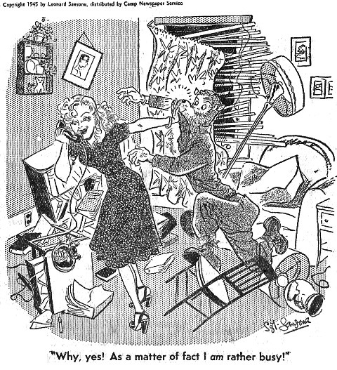 John DuFour came quietly into the barrack the other night, tip-toed down the row of beds. He undressed, hung his clothes up, lifted the net and sat down. The bed began to shake and there was a loud noise. DuFour stood up and took a good look at the bed. He had been sitting on Al Gentner. It sure is strange what a man's first night out with a woman will do... Visitors this week included Billy Anderson, Charlie Hegeman and Moe Better... A good topic for discussion at the next Monday night Bull and Education Session is "Who Gets the Ratings and Who Deserves Them"... A young and very fair member of the opposite sex asked me to mention Kelly and the banker's hours he keeps. But I haven't the heart to drag Joe through the mud any more. Nomenclature: Dutch Schoenborn Part No. 36176087 Specifications: 195 lbs., 6 feet tall, age 27, brown hair and blue eyes. This is probably the way that Dutch would classify himself if human beings were listed in tech orders. Dutch works in Classification, is best known for his very straight hair that much prefers standing up, for his moustache, and his flashy drawers that he wears when he plays volleyball. He was born and raised in Detroit. He attended high school there and followed this with two years at the Detroit Business University where he studied Business Administration and Stenotyping and earned the right to wear a BCS behind his name. Following the graduation, Dutch worked for the Cook Paint & Varnish Co. until that fateful day - at this point in the story he breaks into a torrent of unprintable words - March 17, 1942 when he was inducted. Regarding his personal life, Dutch is reluctant almost to the point of silence so the period between his induction and his coming overseas in August 1944 is a blank. Sometime during that time, he began to cultivate the stubble on his lip and there are not a few women involved in more than one way. The details will probably go with him to the grave. Boating, the legitimate theater, all sports and his moustache comprise his hobbies. He prefers to drink straight bourbon whiskey with water as a chaser. If he can't get that, he will turn to beer. He loves to eat and his favorite topics of conversation are (1) food (2) women. He has very few violent likes or dislikes. but at times, he has shown a very hot temper especially when someone is singing "Great Speckled Bird" or "Wreck on the Highway." Try it and you'll see what I mean. - Pharo Tennis Team Notches Third Win FRIDAY, JULY 13TH - Tennis enthusiasts at the Monsoon Square Gardens in Calcutta Friday evening saw the Bengal Air Depot's team win its third consecutive match in the tourney by trouncing a strong 10th Weather team, two sets to one. BAD thus continues atop the "A" league. John Reindel, after an extended lay off, took Dubeck of the Weathermen, by a 7-5, 8-6 score. Dubeck's youthful stamina drove Reindel hard before he bowed. Joe Frame of the Depot's team lost a close match to Gross of Weather, 5-7, 7-5, 8-6. Gross' back court driving outweighed Frame's fore court smashes and gave him just the edge needed. The rubber match found Bishop P. Holstein paired with Frame in a doubles set-to against Shaeffer and Bentley. BAD's victory was by a 6-2, 6-2 margin. Officers Claim Brass Crown in Table Tennis The BAD Officers' Table Tennis team made it eleven victories out of twelve starts last Thursday when they drubbed the officers of a nearby airstrip 7 to 2. Hensel, Hutchinson, Hambley and Woolman of the Bengals took their singles handily while their teammates Tyhurst and Valcalda met unexpected defeat to make the score 4 to 2. The Bengal team then had matters all their own to sweep the three doubles sets for the final 7 to 2 victory. By virtue of this triumph, the BAD officers claim the officer's team championship of the theater. They will be willing to play any other officers team in defense of their title.