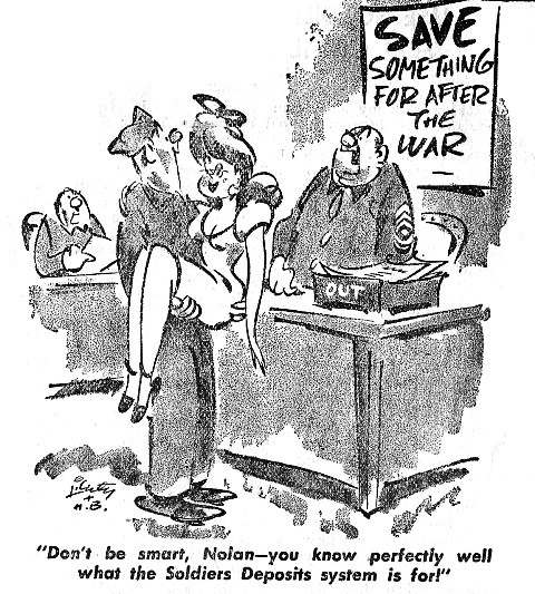 USE SOLDIERS’ DEPOSITS FOR CIVVIES CLOTHES TIGER RAG STAFF ARTICLE In the last war, many a GI came home to find he required a new and complete wardrobe because his old clothes no longer fitted. Just to keep tabs on what a new layout would cost you, your Tiger Rag, at no expense to itself, gained the services of one Henry L. Jackson, presumably a feather merchant who knows his stuff. And the eyebrows started raising towards the clouds as the figures - not feminine ones - were submitted. Hold on to your pocketbooks. A suit these days, just ordinary, costs $40. Three shirts at $2.50 each sets you back $7.50. Two ties which Christmas