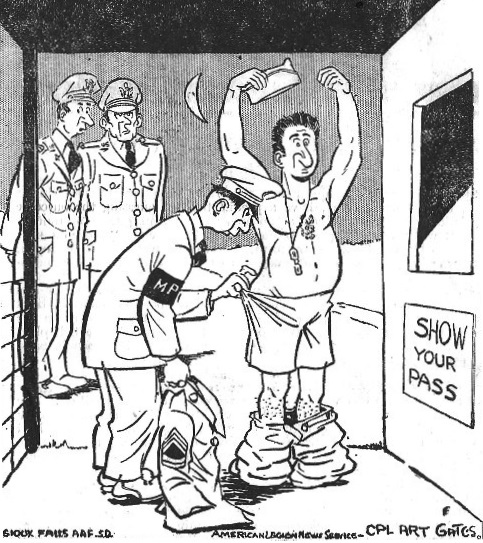 SHOW, BUFFET SUPPER PLEASES Of crowd approbation is true censure one of the most distinctive and engrossing programs given on this Depot was presented Wednesday night when Rajah's Rest featured an Indian Boxing and Physical Coordination Show followed by a buffet supper. Smooth-paced tumbling acts and feats of muscular control were interspersed with brief boxing exhibitions. Headlining the show however were the difficult acrobatic and tumbling acts performed. In one instance when two tumblers were going through their difficult routine the lights were dimmed. One of the tumblers, securely blindfolded and seated atop the feet of a reclining aide, was given a flaming hoop. Using merely the bottom tumbler's legs as a springboard, the blindfolded Indian turned two complete loops in midair through the blazing hoop landing in his former position. Easy?... even a jumping bean wouldn't try that one. Another exceptional display was witnessed when an Indian demonstrated his throat muscles. A ten foot length of bamboo was laid across his throat with three GIs on either side for demonstration purposes. At a signal the six men supported their weight, bending the bamboo almost double, while the Indian withstood the strain against his windpipe. (Even a hangman would shudder watching that trick.) Bishnu Ghosh, who MC'd the show with a delightful humor, demonstrated Judo tactics as a finale until his assistant, who left various sections of hide embedded amid the concrete, gave the signal to desist. After which came the stampede for the food and coke awaiting for free on the counters. The show, secured by Miss Helen Pyle of the ARC, consisted of students from Ghosh's College of Physical Education and members of the Bengal Boxing Association. The Red Cross hostesses really deserve a "Sunday bow" for whipping together this ambitious presentation for it was unique, and, filling. Here 'tis... the bow! New Asst. ARC Field Director Latest attraction at the ARC field office is Marguerite "Mag" Waterhouse, here to replace Leonard Walker as assistant field director. Miss Waterhouse, who comes from Beaufort, SC will look after military welfare, loans, and take care of GIs' personal problems. Although new to India, she has had some experience doing this work up country and has had three years of the same at Parris Island, which according to her is "one tough marine base with no punches ever pulled." Marguerite will introduce a new routine in visiting the sickbay at the Depot and looking after the requirements of the ailers. A graduate of Hollins College in Virginia, her civilian work as a sociologist was with the Children Service Bureau of Charlotte, NC until the "do your bit to help the war effort" urge came on. Mr. Walker is leaving for Calcutta for additional responsibilities but if he has his way he will be China bound in no time at all. Unacquainted Cousins Meet Here It took a worldwide war and a trip of close to 15,000 miles to this Depot to bring together two cousins who did not know the other existed. One of the cousins is S/Sgt. Jack Friedman of 9th Engine Overhaul Sqdn. who hails from New York City. The other is T/5 Ben Bronstine of the 923rd Signal Co., coming from Denver, Colo. Ben claims he never knew Jack existed until after his arrival here. He wrote to an elderly relative who told him of the relationship and proximity of Jack. "Then we found we had been stationed at the same time at Shepherd Field, Texas. Moreover, both of us were taking Army courses in New York City together. Talk about coincidences." THE TIGER RAG is a weekly publication edited and written by and for the Enlisted Personnel and Officers of APO 492, and is under the direction of the Commanding Officer, COLONEL FRANK D. HACKETT and Public Relations Officer, MAJOR STUART R. PETERSEN. STAFF: EDITOR... Pfc. Hollis H. Estill; ASSISTANT EDITOR... Pfc. Art Goldberg; ART... T/5 Layton H. Wicksten; PHOTOGRAPHY... Sgt. Les Gurwitz. Statements or policies reflected through the columns of this publication under no circumstances are to be considered those of the United States Army. Articles submitted by Officers and Enlisted Men represent personal opinions only. Internet adaptation by Carl W. Weidenburner.