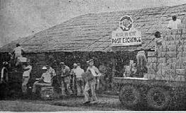 Two o'clock arrived. One second later, whether by fortune or strong elbows, Cpl. Robert Simpson of 9th Eng. Overhaul staggered away bearing the first case of unrationed beer ever sold on the Depot. Thus began a sale equaled only perhaps by Macy's bargain basement in New York. A whimsical monsoon spread a few raindrops for size. But unnoticed during the melee it became discouraged and moved on. Down the street, into waiting trucks, the beady liquid vanished out of sight like crickets in a wood pile. Finally, drenched in sweat, but with the cigar-boxes overflowing with rupees, the PX wallahs were alone with empty trucks. Thirsty GIs, four rupees poorer but gastrically much richer, had fled to investigate their purchases and determine whether the Hyde Park beer was actually flat, which was why it was disposed of unrationed. Next day, an additional 500 cases were secured. It too disappeared like a rock in a whirlpool. Which only goes to show that beer is beer, flat or otherwise, and that most GIs like it anyway they can get it.