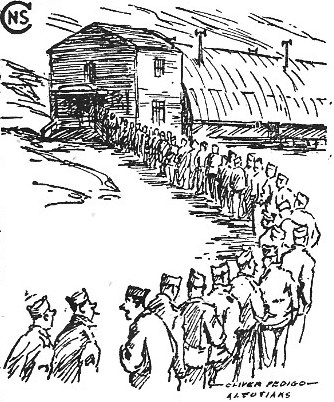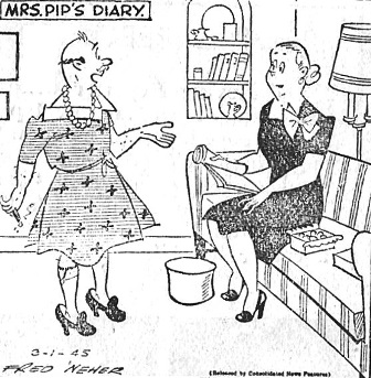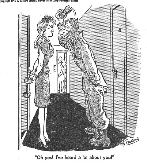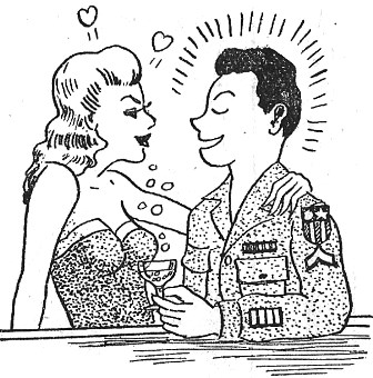 Some people like to talk, about themselves, about their hometown, about anything. But perhaps even better than just plain talk, they like a good argument. I ran into one of these characters last week. I walked by his desk and smiled "good morning" and he started talking. He began by telling me that he was born in Los Angeles in the beautiful state of California in July 1919. He told me about all the beautiful places that he had lived. He gave me the impression that his wife and two children, a boy age one and a girl two, are waiting for him on Telegraph Hill in San Francisco. Then this character went on to tell me that the fateful day when he put on his brown zoot suit for Sam was in June 1941. He talked on about his days in the Army and for some strange reason, he was always stationed in that beautiful state, California. The only point in his whole story where he covered up and did some quick double talk was when I asked him how he got his five stripes. He said something about: "That is something else again but it had nothing to do with work." He changed the subject and started telling about those days in bountiful California when he used to be a stock clerk in a ladies full fashioned hosiery company. (What a racket that must have been. Trying stockings on shapely legs all day). But he doesn't want to go back to that. He wants to be a personnel analyst for the U.S. Employment Service. He should have been winded by this time but he was still talking breathlessly about the last bourbon he had in 1943 and the beer he drinks over here. Speaking of here, he left the States in May 1944 and has 83 points to his credit. It won't be long before he will be seeing San Fran from the California Street cable car and what is the first thing he is going to do when he gets back? Pick up his hobby where he left it - and his hobby is marriage! He hopes that his wife will recognize him. He is still skinny and more anemic looking but he still has the same light brown hair that always looks like he just washed it and can't do a thing with it and the same blue eyes and happy face. This character could go on talking endlessly and if you like the bull shot at you or if you like a good argument, go up to Special Handling and ask for Ray Lower. Or bring yourself and your beer over to barrack C-105. - HCA