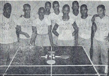 Devils Beat Signal For Show Title The Devils of the 1961st QM Truck Co. took the Depot Horseshoe Championship by trimming the 923d Signal team in three out of the first four games Saturday evening on the 83d Hq. Sqdn. court. Both teams completed the regular schedule with identical records of six wins and one loss. The schedule was protracted due to the monsoons which made the courts unusable for long periods of time. Harlow and Holleran of the Signal team took the first set by defeating the Wells-Olds doubles combine of the Devils 21-17. Ames and Pinson evened it for the victors with an easy 21-8 win over Montgomery and Helms. Havlicek put the Devils one up by trouncing Miller in the initial singles game, 21-14, and Coppola applied the crusher by slamming enough ringers to take McNerney of Signal 21-9 for the Championship. The unnecessary fifth game saw Tower of Signal beat Armich, 21-19, to bring the final score to 3-2 favor Devils. A team trophy and individual cups were presented to the victors while the Signal squad received a runner-up trophy. The tourney completed the Special Service Office's sports schedule for 1944-1945 season.
