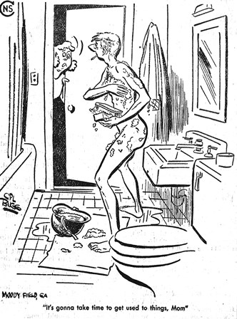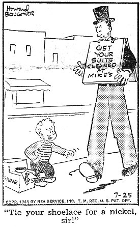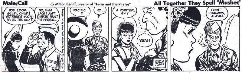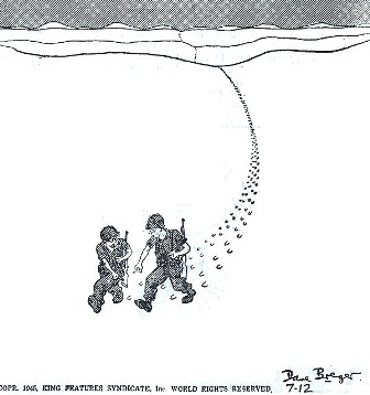 NO PATENT ON COOK'S INVENTION A complete new innovation for keeping squadron lawns trimmed was inadvertently demonstrated by Pfc. Howard McCaslin, chef de cuisine in the new area. The innovation was prompted by curiosity and one (1) motorcycle someone had momentarily tethered outside basha U-308. McCaslin's system, guaranteed to shear grass, and in fact keep shrubbery down to the raw roots, consists merely of mounting the said motorcycle with one carcass, human, and twisting on the gas. Passersby extricated McCaslin from underneath the machine but not before a sizeable area of turf was plowed clean and in general splayed all over the landscape. Parties interested in weed removing may contact Pfc. McCaslin personally at U-308 where at present the inventor is nursing a mangled leg. RATION-FREE BEER SOLD QUICKLY "Beer... BEER... BEER!" The rumor spread out via the GI grapevine even before the foamy brew was unloaded off the barges. "It's unrationed and first come, first served," went out the news. Then came the trucks. One huge forty-foot trailer job piled high and another 6x6 stacked low but solid. A glaring banner tacked on the side stated that the stampede would begin at 1400 o'clock. Before 1400 o'clock queues of men started forming, jockeying into position and making a ragged khaki rope down the street. Tugs, jeeps, and weapons carriers bounced dust along the curbing disgorged men,