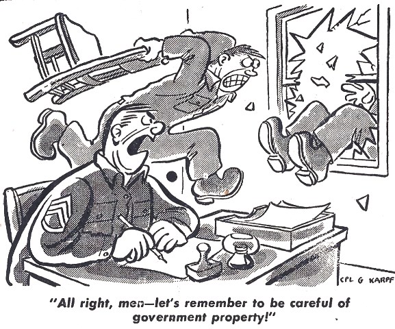 Dear Editor: In regards to your "Time Saving Device At Mail Call" write-up, which appeared in 14 July 1945 edition, the following information is submitted for the benefit of the readers of Tiger Rag. I will give you the history of the Mail Board at the 1953d Ordnance Co. The Mail Board was originated December 1943 by the Mail Orderly at that time. The purpose was to save the men time and trouble of sweating out Mail Call and to save the Mail Orderly the trouble of bellowing out the lucky names. 1st Sgt. Prevour at that time was T/Sgt. Prevour, Section Chief of OGS at the Ordnance Warehouse. T/Sgt. Aaron, whom he gives all credit for the Mail Board, refused to letter the Board for reasons unknown. The Board was made by Carpentry Section, painted by the Mail Orderly and the names were lettered by T/4 Charles W. Faulkner, one night in December '43, as he performed the duty of CQ. Up until 14 July 1945 the Board had served the purpose intended. If anyone wishes to make it known to the public, why not give the men credit who are responsible? When 1st Sgt. Prevour was assigned duties of 1st Sergeant the Mail Board was and had been if effect for over six months. Several men had been transferred out and into the company. Thus, a new Board was made and the T/Sgt. Aaron took care of the lettering which one might call a request order. - T/5 Frank G. Jackson