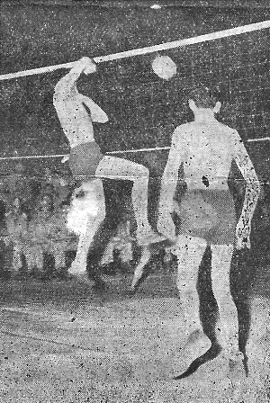 BENGAL AIR DEPOT SECOND IN THEATER VOLLEYBALL The first game was Hialeah's all the way. The BAD team couldn't get started and before they knew it the Pick-Ups had too big a lead to overcome. The smashes of Becker of Hialeah kept the BAD on the heels continuously. Using either hand and taking advantage of set-ups by his teammates the six foot, 195 lb. Becker drove the ball repeatedly back to the opposite court with such force that it couldn't be handled. The BAD team found themselves in the second game and started with a 3-0 lead over their opponents. The Pick-Ups again led by Becker came right back on their serve however, and tied the score. A see-saw of service and points went on for several moments and then a couple of errors by BAD put Hialeah ahead 10-7. BAD recovered the serve when Redmon lobbed one in close to the edge of the Pick-Ups' court. Kelly served for the Depot aggregation and as Becker attempted to smash the ball over, Scatena leaped up and smashed the ball right back into his face for a point. Outstanding plays by Shanks, Schoenborn and Kelly followed in rapid succession making the score 11-10 in favor of BAD. It looked as though the Hialeah outfit had fallen apart but again Becker came through and drove the ball three consecutive times into the BAD court with such force that a return was impossible.