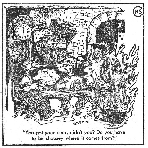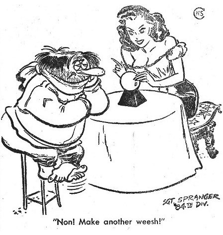"Have you got any salt on your table?" "Ya. Somewhere. Here." From his house you can just smell the... "Here, you can have it back, it's pepper." "Try this. Maybe it's salt." "Never mind. I'll put a little jelly on it." I never found out what you can smell from his house. Clem had his mouth full of soup and when he got it emptied, he started talking about the marking device company, R. A. Stewart & Co., Inc., he used to work for. This company is located in the Wall Street District which is, if you know anything about New York, a long way from Brooklyn. Clem commuted back and forth in his own car. The idea of a New Yorker driving his own car to work was fantastic and I made him repeat it several times just to be sure that I had heard him right. Clem was inducted at Camp Upton on April 2, 1943. He left behind him his wife and "one demobilizer," a little girl named Marianne. The Army pushed him through basic and clerical school at Fargo, North Dakota. He was shipped overseas in November of the same year. He is now a sergeant and holds down a steady position in the Engine Branch. At home, Clem was a quiet fellow drinking nothing but Vat 69. Over here he drinks... "Salt?" "No salt!" ...almost anything that come along. And his hobby is poker. He never wins but plays it for experience and laughs. When the war is over Clem is going back to his rubber stamps. I worked, he explained between hunks of pineapple, in the distribution section which is similar to stack control. How anyone can want to go back to anything that is similar to stock control is beyond me. "No, there's no salt on this table." HCA
