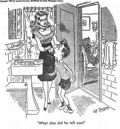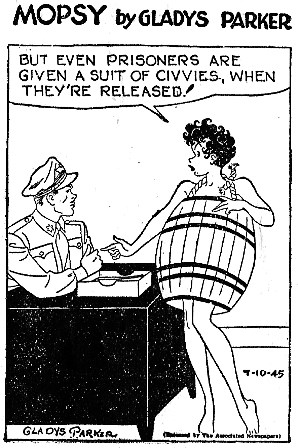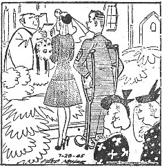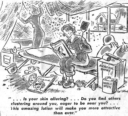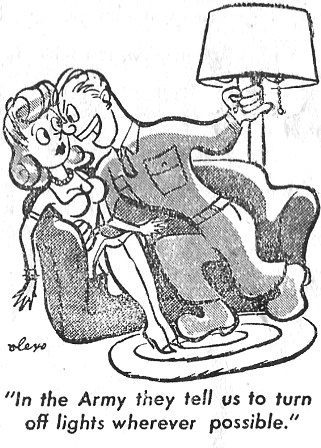 "Gave us the Bronze Star. Everybody in the outfit got one and Van Bodegraven and I were part of the everybody." Craft polished his fingernails. "It's five points, you know." "Yes, but -." Van Bodegraven held up one restraining hand. "We know what you're thinking. But far be it from us to question the powers above. We're just sergeants and technicalities like combat stars and rotation are beyond our comprehension." "That's right," Craft said righteously. "One can't just walk up and say 'keep them' to the government. One might get busted, mightn't one? I must confess I've been wondering tho'." "Wondering?" "Yes. What if Van Bodegraven or I had cut ourselves while sharpening a pencil with that outfit? We might have received the Purple Heart and rode down Broadway on the back of a huge car when we get home." We left the Finance Office quietly. Then men went back to their grim duty of following 'The Batman' as he chased a criminal through a deserted warehouse crackling with fire. And they were smiling... The Tiger Rag is a weekly publication edited and written by and for the enlisted personnel and Officers of APO 492, Air Service Command, and is under the direction of the Commanding General, Brigadier General Frank D. Hackett and the Public Relations Officer, Lt. Col. Edward B. Dixson. STAFF: EDITOR... Pfc. Arthur Goldberg; NEWS... Sgt. Robert J. McCarthy; NEWS... Pfc. Eugene Bernald; NEWS... Pfc. John Leonard; ART... Cpl. Layton H. Wicksten; PHOTOGRAPHY... Base Photo Lab. Statements or policies reflected through the columns of this publication under no circumstances are to be considered those of the United States Army. Articles submitted by Officers and Enlisted Men represent personal opinions only. Internet adaptation by Carl W. Weidenburner.