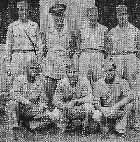 FORMER CO HERE Six GIs from all over the IB and C theaters came in by air, rail and motor vehicle to honor their former CO, Maj. James A. Banton, Depot Signal Officer, at a reunion last weekend which may be a forerunner of many more to come. Planning the meeting weeks in advance, the six GIs were all formerly with the 619th Signal Aircraft Warning Co. which operated the Houston Army Information Center. Each had come by separate means to these theaters by way of the Atlantic and the Pacific. They had accumulated many decorations and commendations since their outfit disbanded a year ago. One of them, Sgt. Herbert J. Castro of Brookline, Mass., is a flying mission photographer. His work in taking pictures of Jap installations at Akyab and Rawree Island won him two battle stars and a commendation. Two others, S/Sgt. Ray H. Squires of Messina, NY, and Sgt. William C. Seegert of Elgin, Ill., now Air Commandos, received citations from Lt. Gen. George E. Stratemeyer, Lord Louis Mountbatten and the King of England for action in China and Burma. S/Sgt. Joseph W. Gray from Carthage, Texas, with an Aircraft Warning outfit in Central Burma, has one combat star. However, it is Sgt. John E. Thornton from Youngstown, Ohio, of the 903d Sig. Co. who bewails his luck of always finding himself surrounded by the ladies. Back at Houston he had all the feminine volunteers on the phones under his jurisdiction. He travelled half-way around the world to assume command, as chief operator here, of all the girls working the Depot's phone exchange. "These women... more trouble," he says. It was Sgt. Thornton who initiated the suggestion of the reunion inasmuch as he was in correspondence with all the other members. "The other fellows kept writing how they'd like to see Maj. Banton, who was the most popular CO most of us ever had. When I suggested the get-together, they jumped at the chance. As usual, the major helped us out on the transportation. We had a great weekend." Sgt. Kenneth W. McLendon of Columbia, SC, made up the sixth member. With the exception of a half dozen GIs, the balance of the original outfit are now serving all over the world and in every theater.