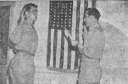 At one of his stops, that at the Depot PX, the General questioned S/Sgt. Louis Scott, PX manager, as well as clerk T/5 Charles Trzcinka of the 923rd Signal Co. regarding the types, quality and quantity of PX supplies available.He also stopped Cpl. Lester Blackwell of the 1212th MPs to obtain a GI's impression of the merchandise being sold and services offered. General Terry believed most of the men realize there still remains a job which must be finished.For that purpose some men will have to remain here.But he desires that the men who do stay in this theater under his command enjoy the same excellent grade of movies, shows, PX items, etc., as those who had been in the theater and have returned stateside. After lunch at the Officer's Mess, General Terry proceeded on his exhaustive tour of the Depot.The small convoy, lead by an MP jeep, first visited the airfield and ATC and ASC installations at Brrackpore, then returned to Kinnison.The next lap took in the Air Corps and Signal Supply hangars and then the huge warehouses at Titaghur.Passing headquarters and later down Broadway, after first viewing the Air Corps Supply areas, the General took in Rajah's Rest, the Depot Chapel and a consolidated mess.The last stretch was through Compound No. 3 to the jetty from which General Terry departed for Hastings. Although the men had not been previously informed about General Terry's coming, military courtesy was noticeable throughout the Depot area, Kinnison and Barrackpore.Colonel Thompson can well be proud of the men who, although busy at their tasks, yet recalled army courtesy on spotting the staff cars and their occupants. SECOND GENERATION FOR RC FIELD DIRECTOR "It's a boy," is no longer news to many of us at the Depot but when it is a grandson, then it is time to perk our ears and hasten the congratulations. No one else than Roy C. Hutchinson, Depot ARC Field Director becames the proud grandpop.Instead of cigars, he was busy passing out loans to all who needed them.And your Tiger Rag came in for a ten rupees donation too.What we need is more grandchildren. ![]() "The biggest fish I ever caught," said Pfc. James F. Hollis of the 903rd Signal Co., seen fishing in Headquarter's Lake, "was a monster I pulled out of the Hooghly River, weighing three hundred pounds soaking wet. "Yes," Hollis continued, "that was a fish.And you know what I used as bait to land that baby?Carewe's! Yessir. I fed a bottle of Carewe's to Angelo (T/5 Angelo Natale of the 903rd) who was fishing with me.He fell into the river and the fish swallowed him whole, fishline, carewe's and all.Then - quick as a flash - I grabbed Angelo's line and hauled the whole mess ashore. "Yessir," said Hollis."That was some fish."And some tale! DFCs AND OAK LEAF CLUSTERS AWARDED Four members of the 1st Air Commando Group, currently attached to the 28th Hq. Squadron, were on the receiving end of well earned decorations from Colonel Glenn C. Thompson, Depot CO, all within the period of one week. One of the chief recipients was S/Sgt. Charles H. Weed, an aerial engineer who hails from Hartford, Alabama.He received both the Distinguished Flying Cross and an Oak Leaf Cluster to his Air Medal yesterday at Headquarters.The DFC was for 50 missions in Burma from March 25th to April 26th of this year during which the C-64 he was flying disregarded all hazards to pour harassing fire on enemy troop concentrations and installations. The Oak Leaf Cluster was for the period from February 3rd to March 24th, 1945 for extraordinary achievement during 100 hours of aerial flight during which Weed's plane was a vulnerable target to enemy fighter aircraft patrols. At the same ceremony, Colonel Thompson handed to Capt. Howard M. Georgi of San Francisco, Calif., the DFC for action with the Fifth Liaison Squadron, AAF, during which time he was continuously exposed to enemy fire and ably assisted in keeping up supplies, artillery adjustments and reconnaissance. The previous Friday, during impressive retreat cermonies, Maj. James R. Woods from Malone, NY received the DFC and two Oak Leaf Clusters to his Air Medal from the Depot Commander.The awards were for meritorious service while flying as a liaison pilot in the Burma campaign. Immediately thereafter, Capt. Julius Goodman, also a liaison pilot who comes from Dallas, Texas, was awarded his third Oak Leaf Cluster to the Air Medal which was made by Col. Thompson in recognition of his services during the completion of more than 50 missions over Jap installations in Burma. Services Held for Cpl. John R. Northall Before an impressive group of friends, funeral services were conducted last Monday afternoon at 1500 for Cpl. John R. Northall of the 48th Depot Supply Squadron at the United States Military Cemetery at Barrackpore. The ceremony, held on the burial grounds with a bright afternoon sun slanting silhouettes among the white crosses, was conducted by Chaplain William C. Hart.Members from Cpl. Northall's former company, the 1212th MPs, joined by men from his present unit, the 48th Supply Squadron, served as pallbearers. A military band complemented the solemn service, a detachment of MPs from the Depot fired a volley, and the flag descended to half mast as "taps" was played.Then as his hundreds of friends stood with bowed heads, the flag was raised to the top of the pole where it waved and furled in tribute to a fine soldier. Cpl. Northall arrived at the Depot in February, 1944.He joined the Army in July, 1943.He is survived by his wife, Mary, and his mother and father.Closely associated with this paper, Col. Northall was one of the staff at the Base Photo Laboratory.