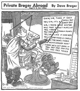 PX Explains Certain Popular Brand Shortages The reason the PX is out of your favorite brand of cigarettes occasionally is that in the monthly quota alloted, an over-abundance of certain brands are delivered.This necessarily means that other brands will be cut in quantity according to the PX. When cigarettes, or for that matter anything, are ordered from the main warehouse only the total number of cases can be specified.Out of that total, the warehouse proportions the brands so that the more popular varieties form the bulk of the order. Sometimes a shortage of one kind of brand or another makes it necessary to supplement or fill in the order with another brand. Capt. Charles B. Hemenway, Depot PX Officer, is able to solve the problem sometimes by trading some of the over abundant brands to other PXs in the vicinity.Since the standard brands are almost universally popular in the same ratio, and Luckies sell out first, it is well nigh impossible at times to effect a trade. You Can Keep Dog Tags When They Let You Out Washington (CNS) - Here's what you're entitled to keep when you are honorably discharged or placed on inactive duty, regardless of climate, season, or location:one barracks bag, one belt, one pair of shoes or boots, one garrison or service cap, one blouse, one mackinaw or overcoat if required for warmth, one raincoat or poncho, 2 shirts one of which may be wool if in soldier's possession, one pair of cotton trousers or breeches, one pair of OD trousers or breeches, appropriate insignia, all gloves, handkerchiefs, dog tags, ties, socks, toilet articles, towels and underwear. Comparable clothing including the WAC utility bag and scarves are to be retained by EW upon separation.The yellow honorable discharge emblems are to be sewn on blouses, shirts and coats during the process of separation.