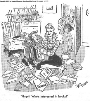 FOR THOSE WHO TAKE By GAB Word comes from one of the more glamorous army publications the not unknown news that the Army Postal Authorities have perfected a device to thwart the potential smugglers of GI equipment and contraband into the U.S. from overseas. The insidious invention is known as the Inspectoscope and operates on the X-ray principle with a fluoroscope screen added to speed up the operation. Anything made of bone, metal or of high carbon content in the packages being examined is visible on the viewing screen.If the shape of the visible items are identifyable as fire arms, hand grenades, GI equipment or items that aren't legally mailable the box is opened and the illegal items confiscated. Contraband articles are turned over to the Customs Office and if those items are proven to be stolen government property the guy who sent it lands in the guard house. Let us dispense with formality and get down to other aspects of the situation. In the first place, our souvenir collectors must be a bunch of potential Al Capones or Dillingers or gentlemen of the ilk.Why does a guy want a box of live hand grenades?To drape across the mantle, maybe?or could be, the favorite nephew would like to chaw on 'em in his crib.Personally, we don't think the little tyke has enough strength to pull the pin. On the other hand, the senders of automatic rifles, tommy guns, and light field pieces might well be itinerant hunters of wild game who had bad luck in bagging a string on their last civilian hunt.Nothing like a .37 millimeter shell to bring down a deer! We prefer to think of the firearms shippers as men of good intention who are just going to start a museum or something.It might even be possible that a few covet a secret dream that someday, far in the future, they'll march down the main drag in Mauchchunk, Pa. in the veteran's parade with an old fashioned weapon called a tommy gun over their shoulder. The newspaper account of the parade might even mention their name; "The fiftieth anniversary of the Great War was celebrated today by a parade of the only living veternas.Among the aged marchers was one Joe Q. Schmerecase the only veteran to carry a firearm.He proudly displayed an archaic weapon known as a 'Thomas Gun' or 'Tommy Gun' that he 'borrowed' while a member of the armed forces." The article won't mention that Joe also shipped home some live land mines and a few flame throwers 'way back when' and got caught and spent a good while in the guard house. GI clothing will be nice for postwar wear, it seems.We have spent over three years in khaki and O D burlap and shudder at the thought of wearing things that even resemble our GI 'robes of malice.'But the Inspectoscope picks up countless shirts, pants, blouses, field jackets and long johns that clothing savers have shipped home.We suppose it's that guy in the parade again. But no matter why these things are being shipped home, the shipper is going to get in trouble.The Inspectoscope is fool proof and very impartial.It doesn't know that Aunt Minnie asked for a Jap rifle and that Aunt Minnie wouldn't hurt a flea let alone shoot someone.But if the rifle is termed contraband, poor nephew winds up in the guard house. If you just have to send some of that stuff home, first find a way to beat the inspectoscope.They claim, so far, nobody has. Moreover suppose you did get some live explosives past the censors.Unsuspecting civilians just don't know how to handle those things.Even written instructions are no good. One story in particular sticks in our mind about the GI who shipped home a collection in which reposed two hand grenades.he told the folks in a letter how the 'infernal machines' worked and to be sure and not pull the pin unless they were prepared to leave the vicinity. Well, as all stories go, the folks decided to make use of the handy little demolishers.Being simple country folk used to simple country ways, they had possessed for a number of years a little house adjacent to the main buildings that served as a communing place for those who felt need of rapport with nature. Through the years this little building had deteriorated till finally the head of the house decided to remove it in favor of a new edifice.At the precise time of his decision GI Joe's package arrived with the aforementioned articles of destruction.GI Joe's old man could hardly contain himself when he hit upon the idea to satisfy his curiousity about the hand grenades and at the same time rid the household of it's unsightly back house. In his eagerness, since this story has to be plausible, he forgot that Grandpa had annexed the out-house as his personal study. Grandpa's selection of the site for his rendezvous with thought "was incongruous but for himit solved several problems and suited his mood for peace and quiet. But top get back to the head of the house.Taking one of the grenades he meticulously pulled the pin, counted three and tossed the pineapple in the direction of the Temple of the Bowel. From the smoke and falling timbers, Grandpa staggered with his galluses trailing and an amazed expression on his face.The look of amazement slowly changed to one of all-knowing and secret satisfaction.Turning to Pop he said: "Allus knew them things was par'ful, but ah kind of outdid m'self that time." So you can see how innocent little gifts like hand grenades or bombs can upset folks at home something awful.And give wrong impressions!!