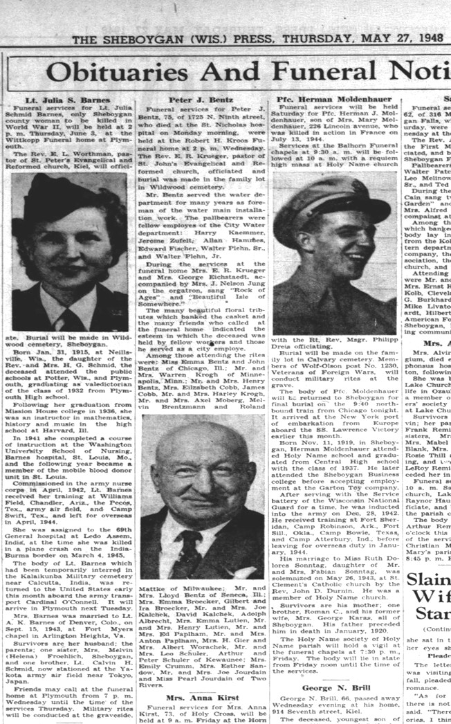 Funeral services for Lt. Julia Schmid Barnes, only Sheboygan county woman to be killed in World War II, will be held at 2 p.m. Thursday, June 3, at the Wittkopp Funeral home at Plymouth.
