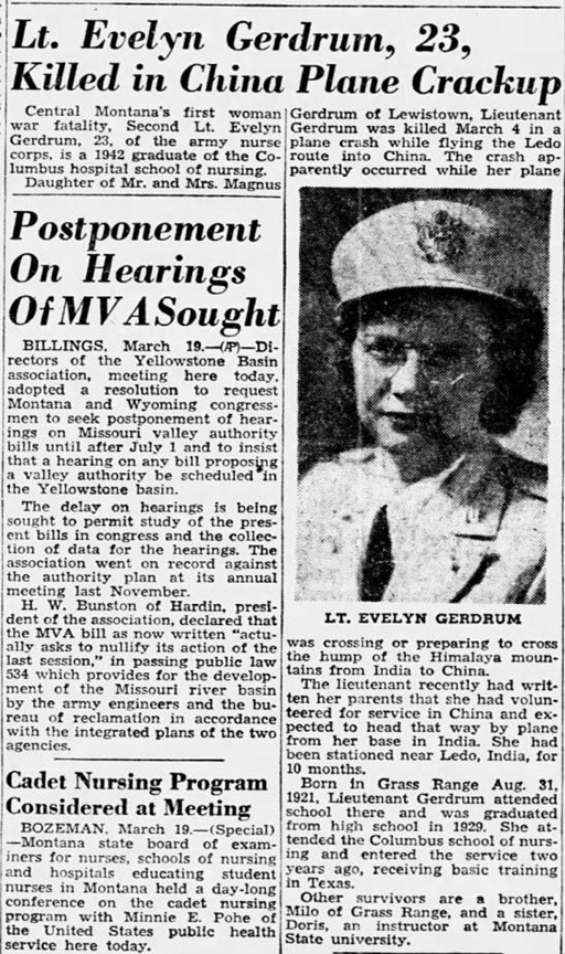 Daughter of Mr. and Mrs. Magnus Gerdrum of Lewistown, Lieutenant Gerdrum was killed March 4 in a plane crash while flying the Ledo route into China. The crash apparently occurred while her plane was crossing or preparing to cross the hump of the Himalaya mountains from India to China.