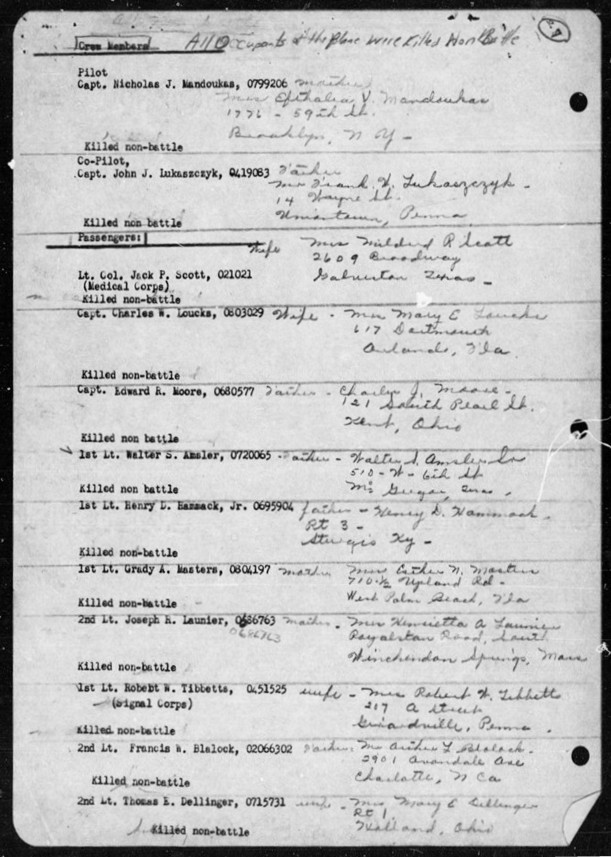 The complete truth about the ill-fated flight may never be known. Those touched by it related what they knew of it to family and friends and bits of the truth emerged. But no family would want to receive news of their loved one's death that characterized it as uneccessary. The War Department saw to it that they didn't. And regardless of the reasons, the real truth is that all these persons died because they were fighting a war. They died seeking brief relief from that war.