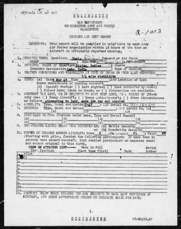 All twenty-seven aboard were killed. The Missing Air Crew Report states that the pilot was "attempting to land, made low turn and crashed," and also "visibility was ¾ mile." Another more detailed description concluded, "When approaching the Ledo Airfield for an attempted landing, the C-47 was, due to fog and low visibility, too low for the last turn and crashed about one mile from the airstrip."