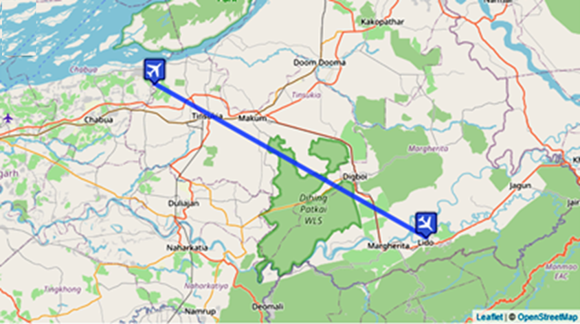 The map shows the airfield of departure (Dinjan, upper left) and the intended destination of the return flight (Ledo, lower right), a distance of 33 miles (53 km). The line between does not indicate the flight path.